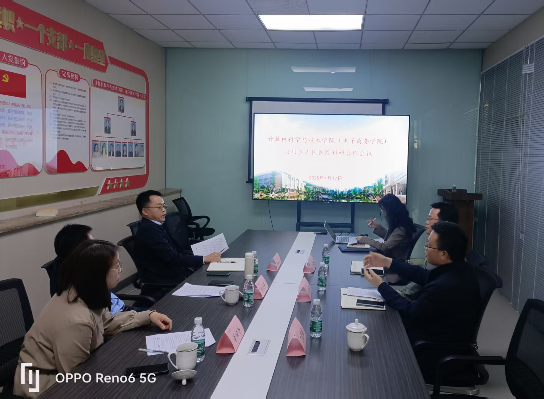 【本网讯】2025年4月17日,汶川县人民医院(阿坝州第二人民医院)党委书记张钧华率科教科负责人鄢传经、干事李丽平一行莅临我校计算机科学与技术学院(电子商务学院),就"医疗健康大数据与人工智能技术融合应用"在学院会议室开展专题科研合作研讨。学院院长向昌成副教授、党委副书记罗南超及马偲臆老师参与了座谈交流。