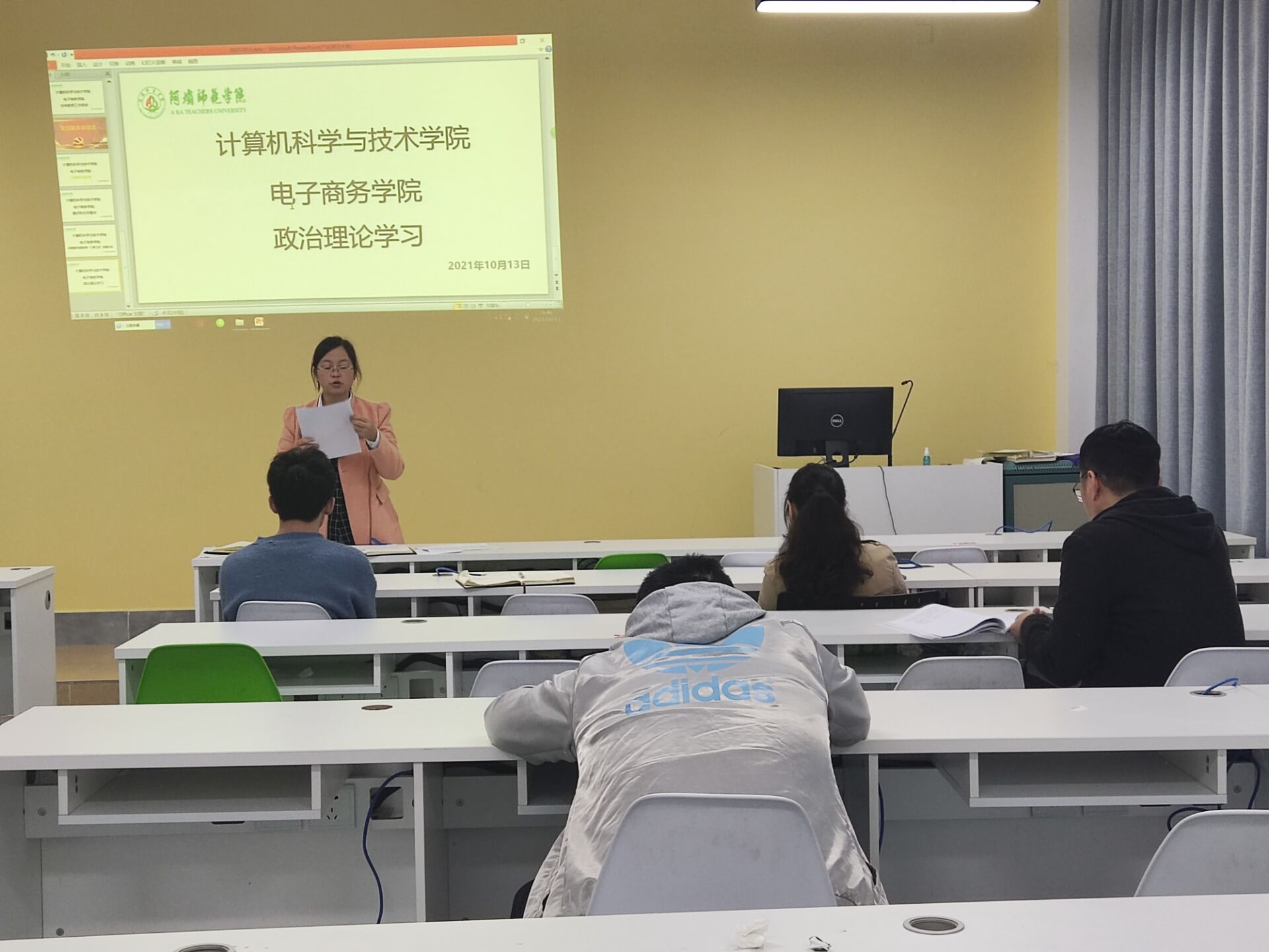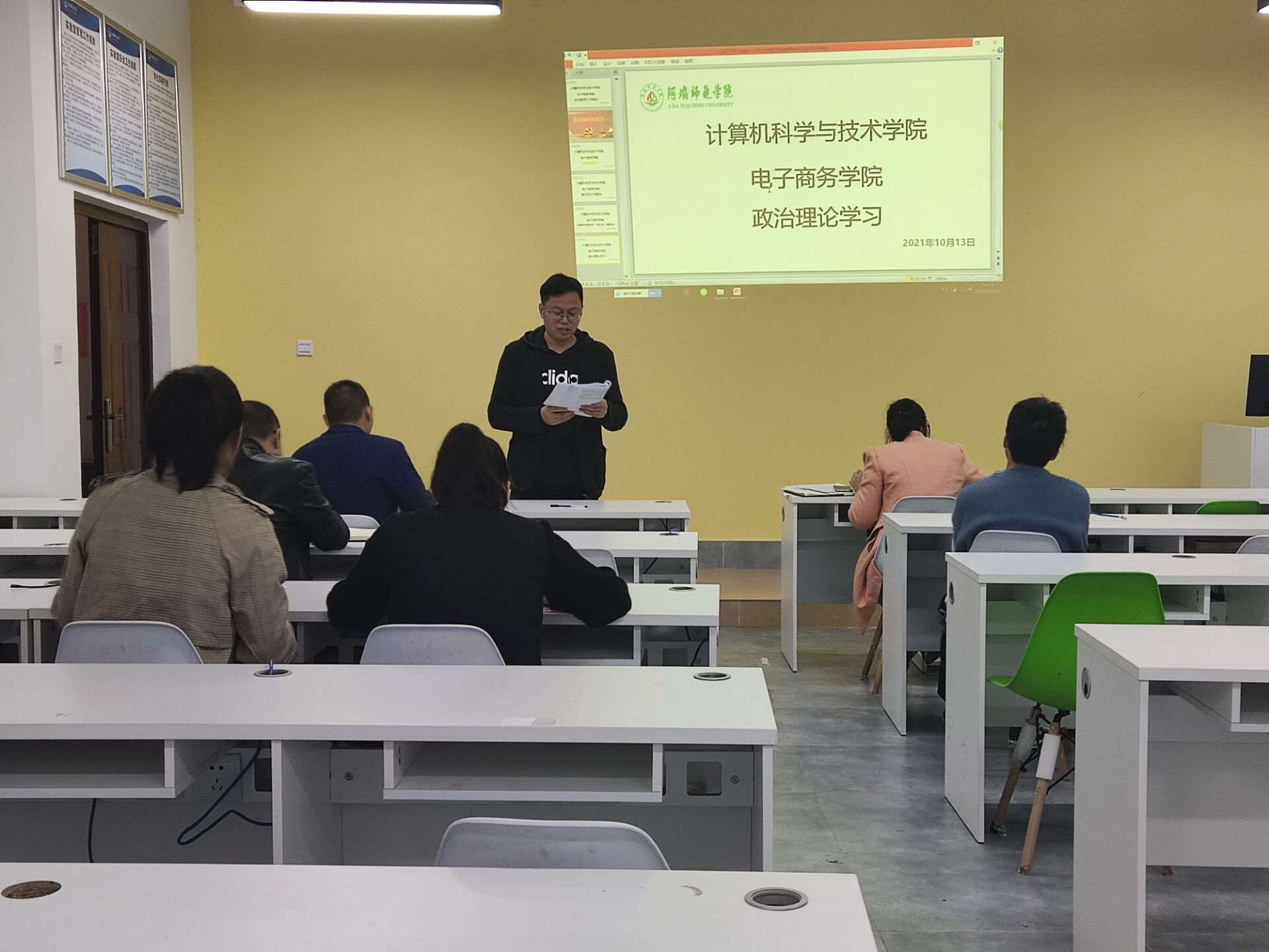 【本网讯】2021年10月13日14:30,计算机科学与技术学院(电子商务学院)党支部在实验楼B108召开了推选党总支组织员和党总支政治理论集中学习的会议。会议由学院党政办副主任谢明玉老师以及学院党支部书记罗南超教授分别主持,全体党员教师参与此次会议。