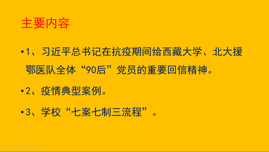 整个会议围绕习近平总书记在抗疫期间给西藏大学、北大援鄂医队全体“90后”党员的重要回信精神;疫情典型案例;学校“七案七制三流程”三个主题进行。