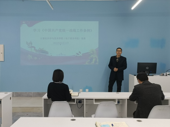 【本网讯】2022年4月13日14:45,为进一步加强党对统一战线工作的集中统一领导,提高统一战线工作科学化、规范化、制度化水平,计算机科学与技术学院(电子商务学院)于实验楼B107教室召开全体教师会议,深入学习中国共产党统一战线工作条例,会议由陈明东老师主持,学院全体党员同志参加。