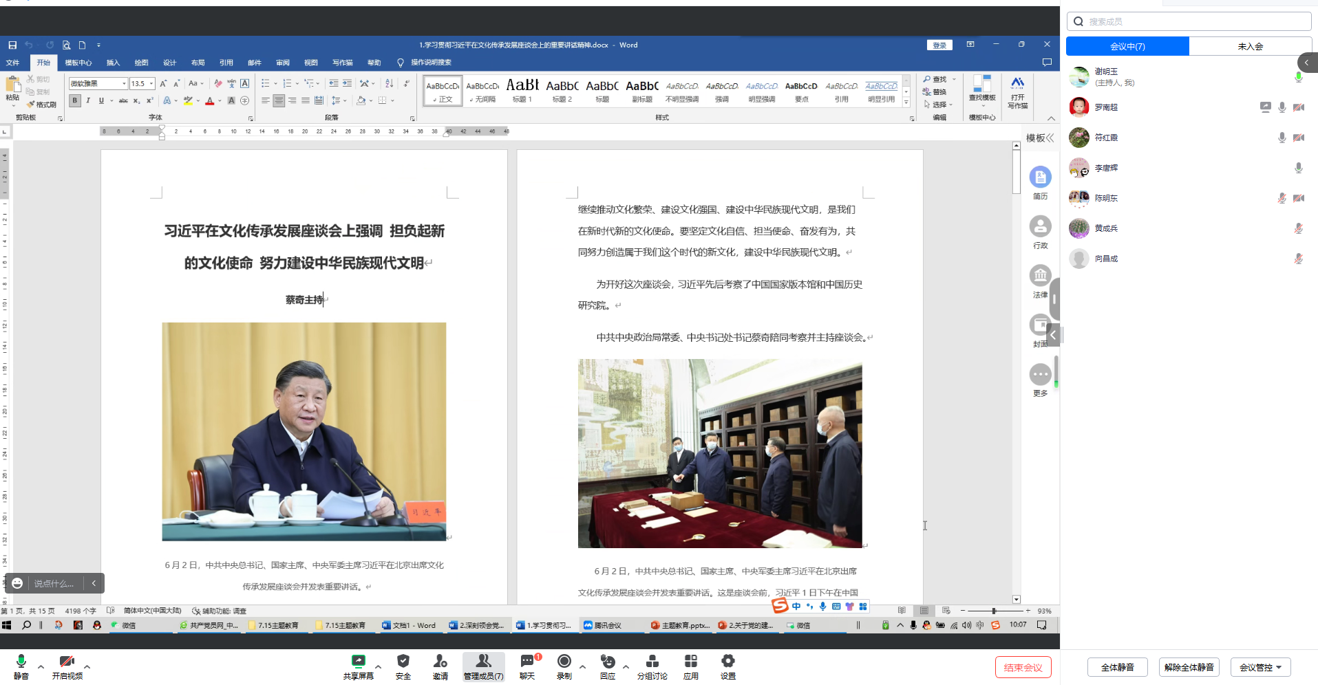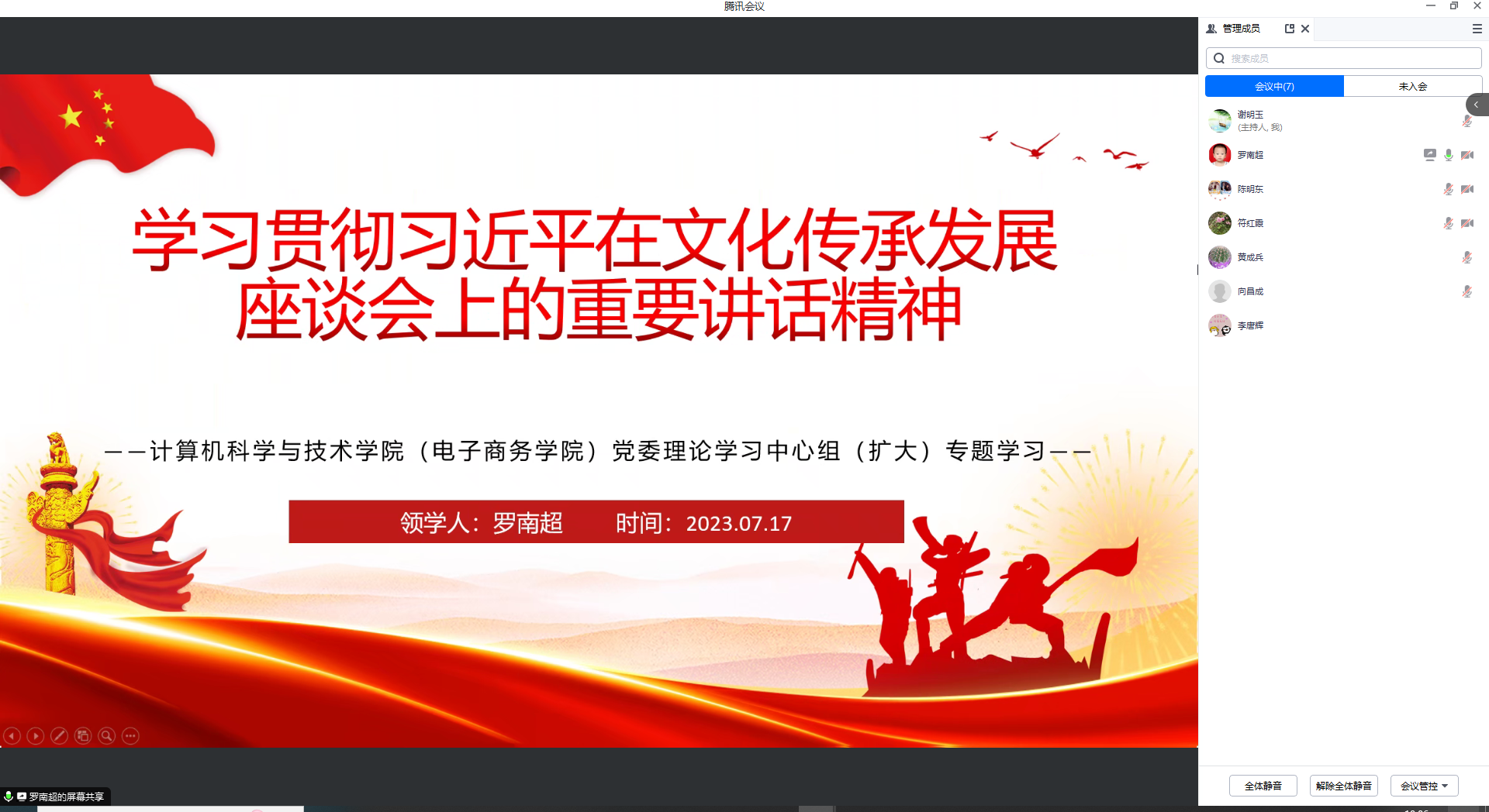 【本网讯】为深入推进学习贯彻习近平新时代中国特色社会主义思想主题教育走深走实,202371710:00,我院在线上召开党委理论中心组(扩大)学习会议,学习贯彻习近平总书记在文化传承发展座谈会上的讲话精神。学院全体党委委员、院长向昌成、教科办主任李唐辉参加会议,会议由学院党委副书记(主持工作)罗南超主持。