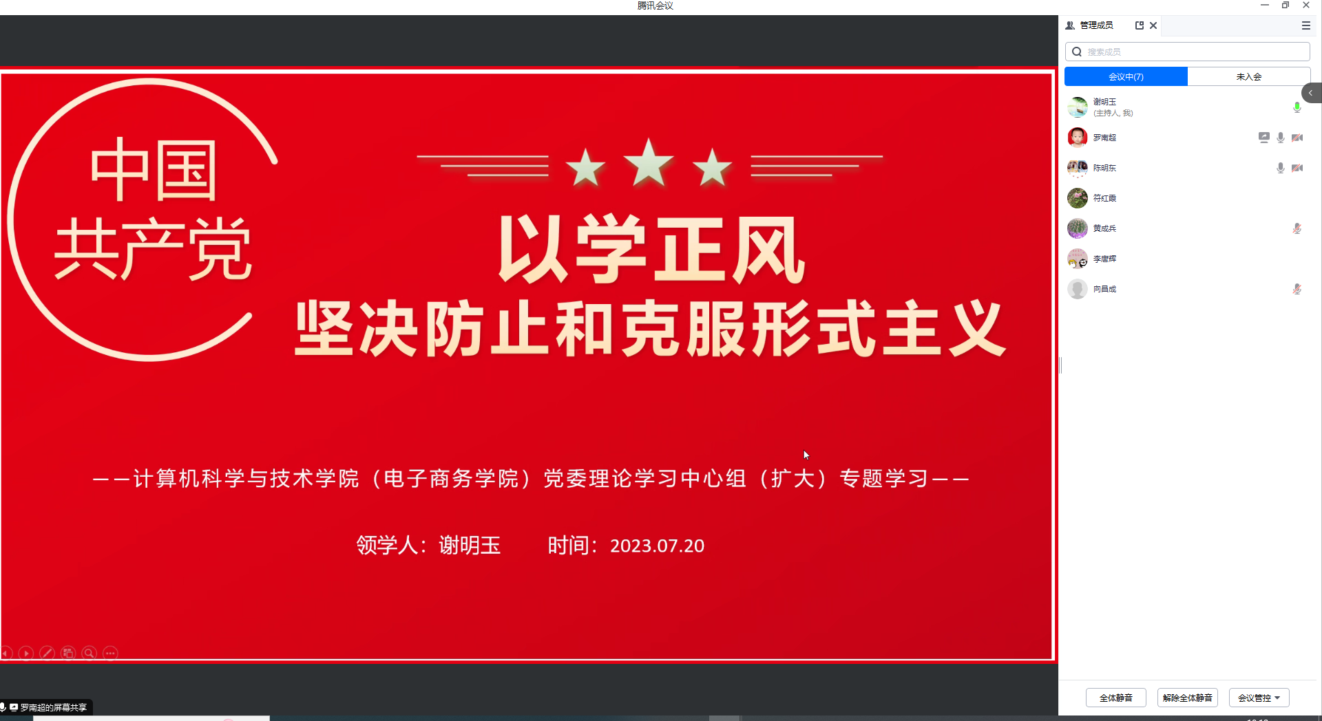 【本网讯】为深入推进学习贯彻习近平新时代中国特色社会主义思想主题教育走深走实,2023年7月20日10:00,我院在线上召开党委理论中心组(扩大)学习会议,学习以学正风——坚决防止和克服形式主义。学院全体党委委员、院长向昌成、教科办主任李唐辉参加会议,会议由学院党委副书记(主持工作)罗南超主持。