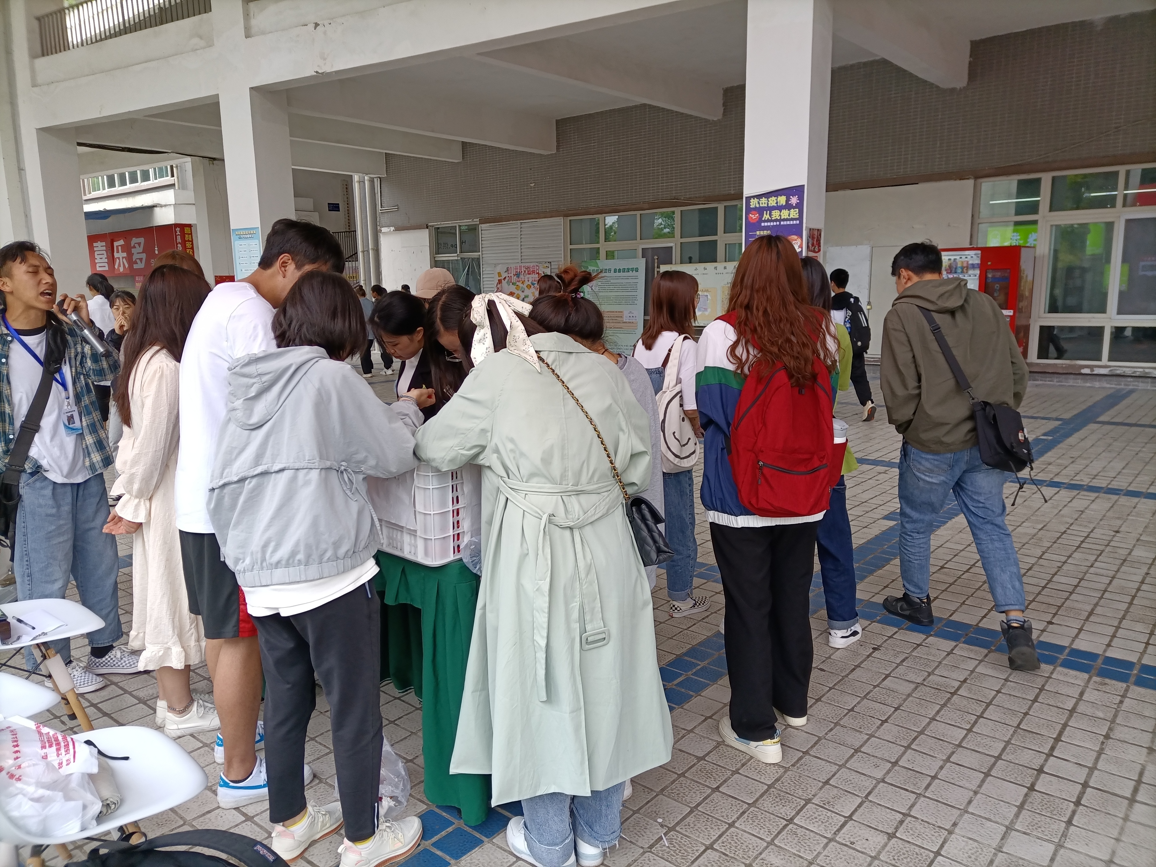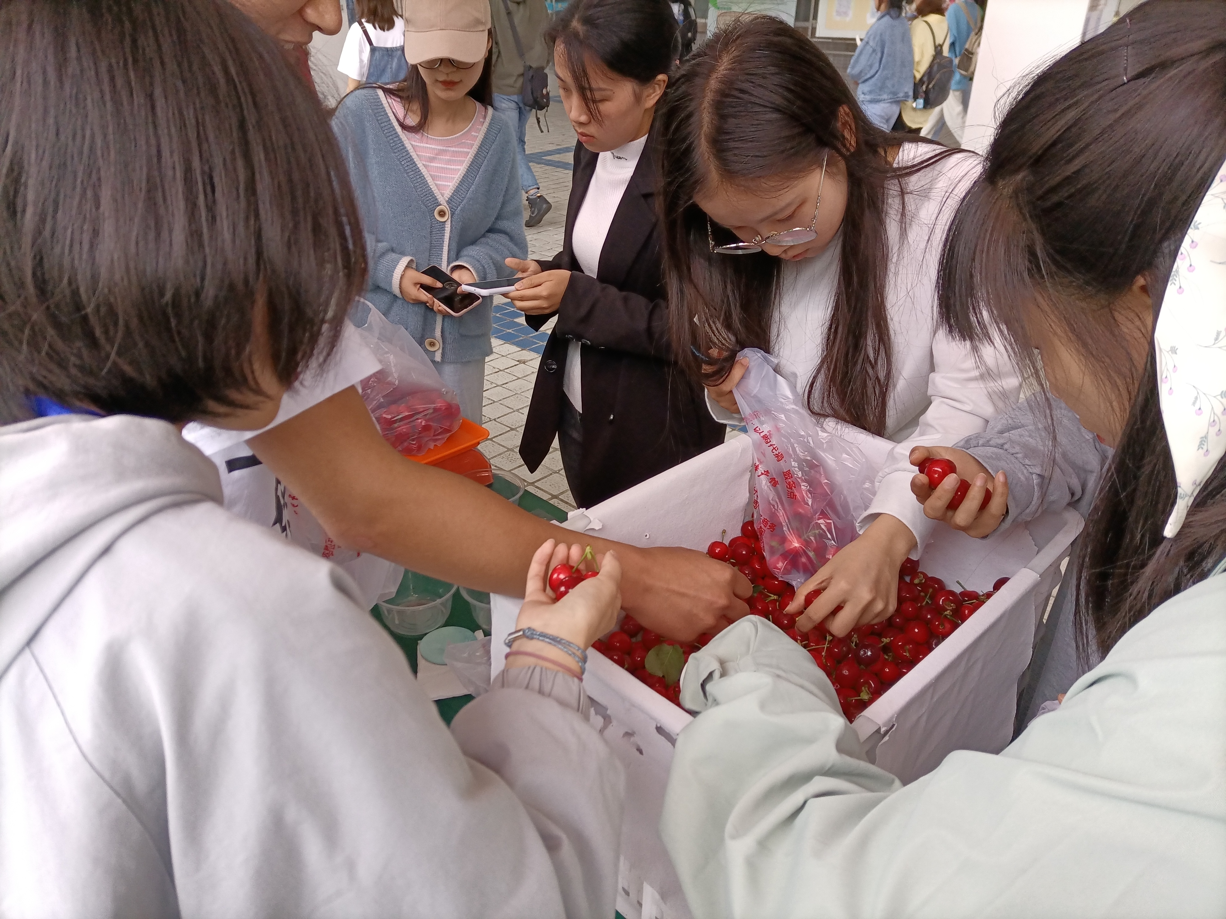 线下售卖小组在学校各个地方设置的卖点与昨日一致。经过昨天的售卖,同学们已经非常熟悉学校的车厘子售卖点位置,也在同学之间相互宣传汶川车厘子的美味。今日的各个销售点都有许多同学慕名前来购买。现场一片热闹。