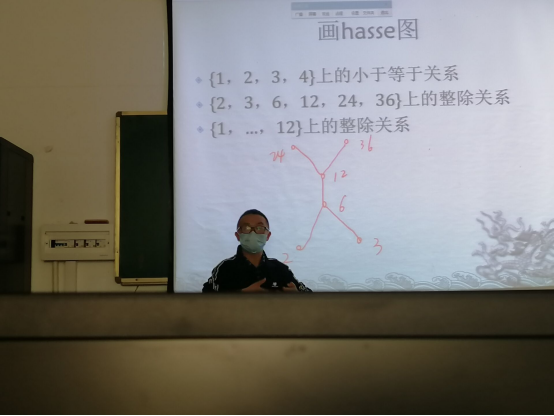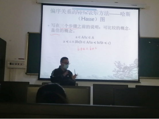 谢老师通过不断举例让学生理解偏序关系的概念,每一个例子都进行了详细的分析和演示。并重点讲解了哈斯图的画法,通过课堂练习让学生及时巩固。谢老师的举例浅显易懂,学生们积极参与并回答老师的提问,课堂气氛活跃。