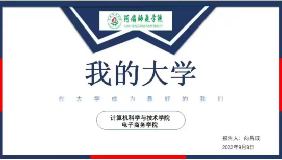 长向昌成根据学院的实际情况,以“我的大学”为主题,向同学介绍了计算机科学与技术(电子商务)学院的历史沿革,师资、教学和科研情况,并向新生介绍了计科、电商专业大学生职业生涯规划。向昌成提醒同学们,应作好心理调整和精神准备,尽快适应大学的学习方式,主动去模索学习方法,主动去选择,拓宽学习内容和学习方式,逐步养成自我管理、自我控制、自我激励、自我反思的学习过程。殷切希望2022届新生,以崭新的精神面貌,克服疫情期间遇到的种种困难,努力学习,成为具有执着的信念、优良的品德、丰富的知识、过硬的本领的新时代的奋斗者和接班人。