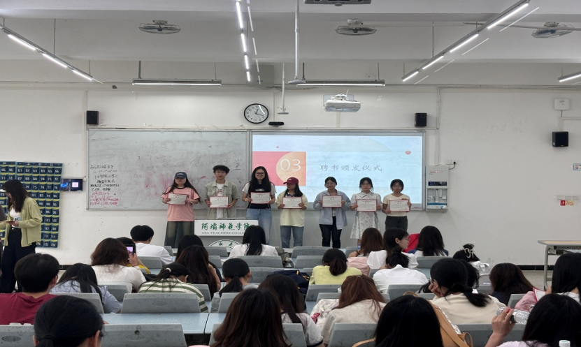 会议聚焦关键议程,首先公布了第六届三委会拟推荐人员名单。过去一年,第五届三委会成员积极履职,在学术活动组织、学生权益维护、校园文化营造等方面成效显著。此次拟推荐人员经过层层筛选,在能力、责任心和奉献精神上表现突出。主席团成员逐一宣读名单,现场掌声雷动,这既是对拟推荐人员的祝贺,也饱含着对新一届三委会的期待。随后,会议进入激动人心的聘书与优秀干部荣誉证书颁发环节,由第五届三委会主席团成员代为颁发。一本本荣誉证书,是对三委会成员们过去一年辛勤付出的高度认可。优秀干部代表上台发言,分享了加入三委会后的成长与收获。从初入时的迷茫,到如今能够熟练应对各项工作,三委会见证了他们的蜕变。这份荣誉是激励也是责任,他们也将带着这份信念继续前行。
