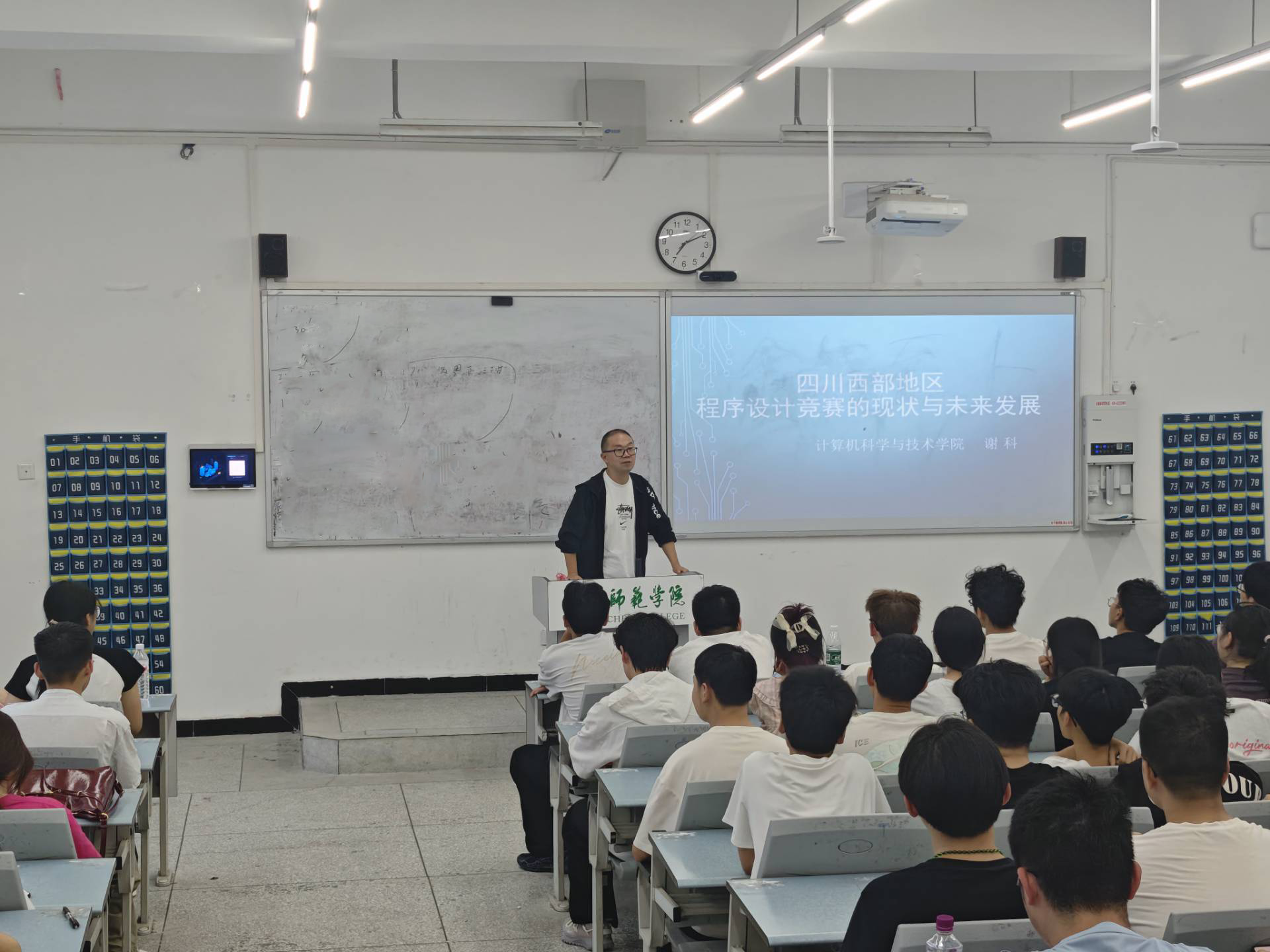 【本网讯】2025年9月8日晚,计算机科学与技术学院在树人楼C栋302室,面向开设了程序设计基础课程的大一新生举办了题为“四川西部地区程序设计竞赛的现状与未来发展”的专题讲座,主讲人为计算机科学与技术学院程序设计类竞赛教练谢科老师。在讲座中,谢老师首先介绍了程序设计竞赛的赛制,分别介绍了ACM赛制、OI赛制和IOI赛制的特点和区别,并向大家介绍了我校学生目前参与的程序设计竞赛。接着他向同学们介绍了我校目前程序设计类学科竞赛的参赛情况和取得的成绩。最后围绕如何参与程序设计竞赛以及训练安培,谢老师介绍了目前我们的训练计划,并勉励大家不虚度四年的大学时光,在学业上能有所长、能有所成。