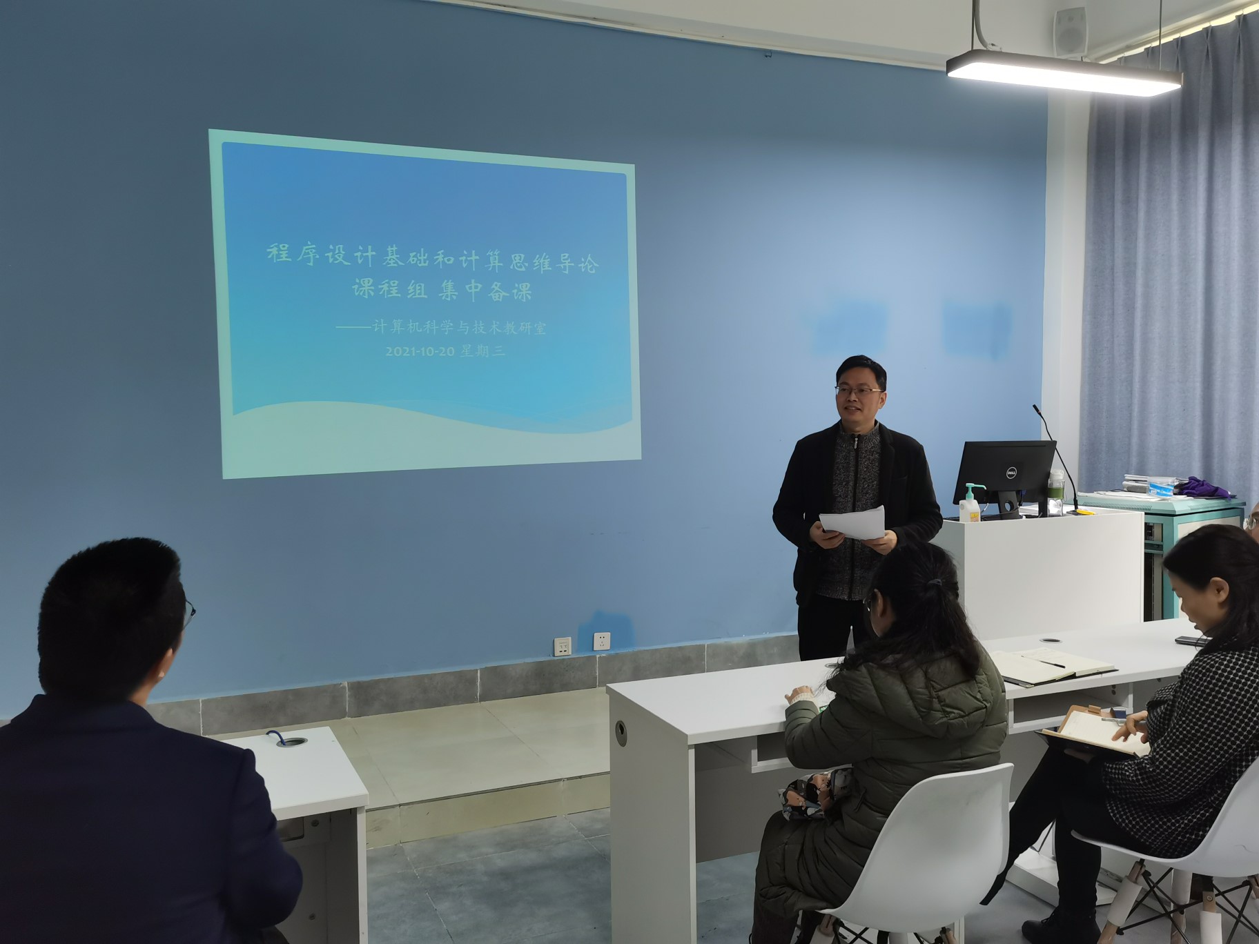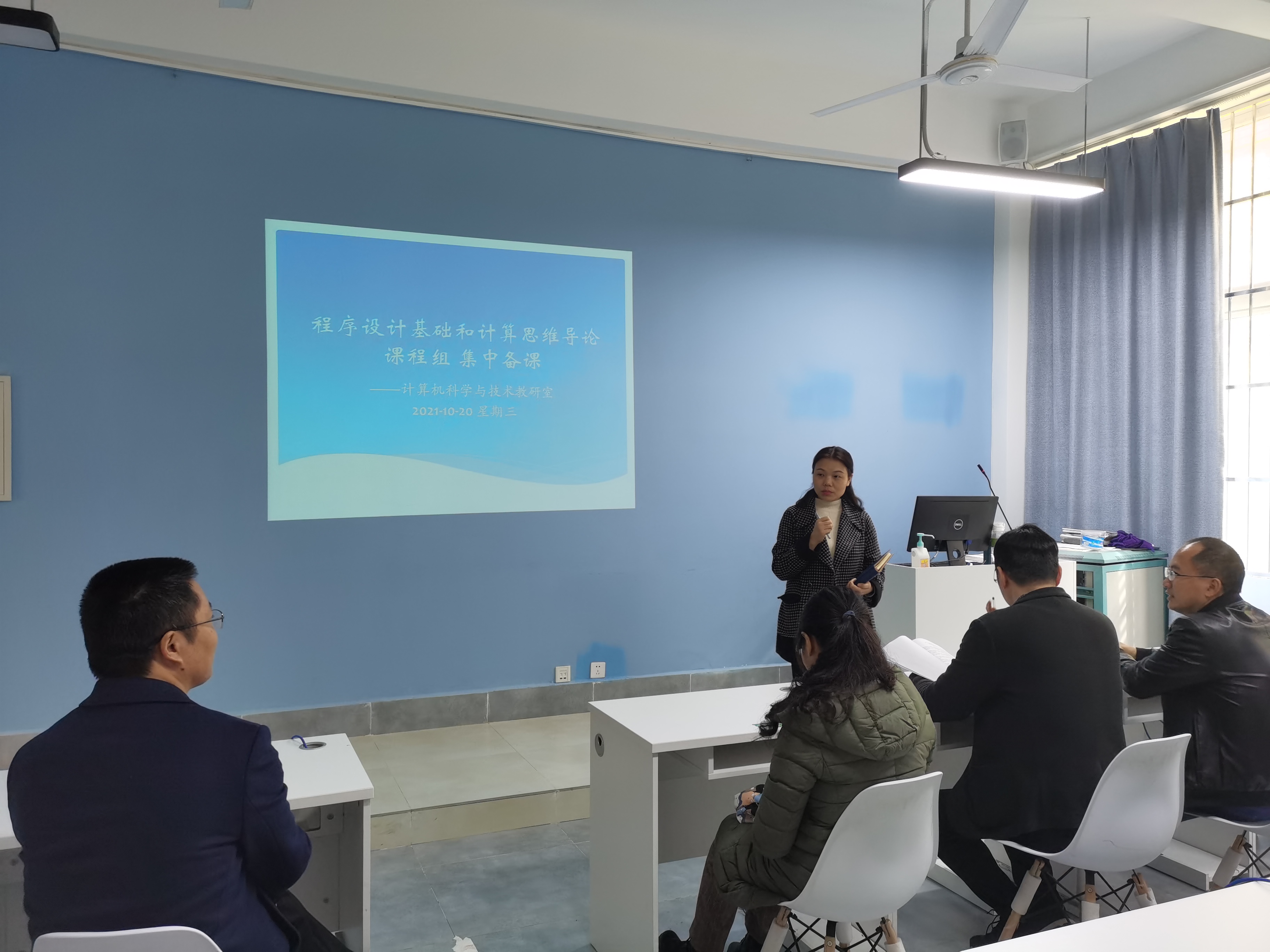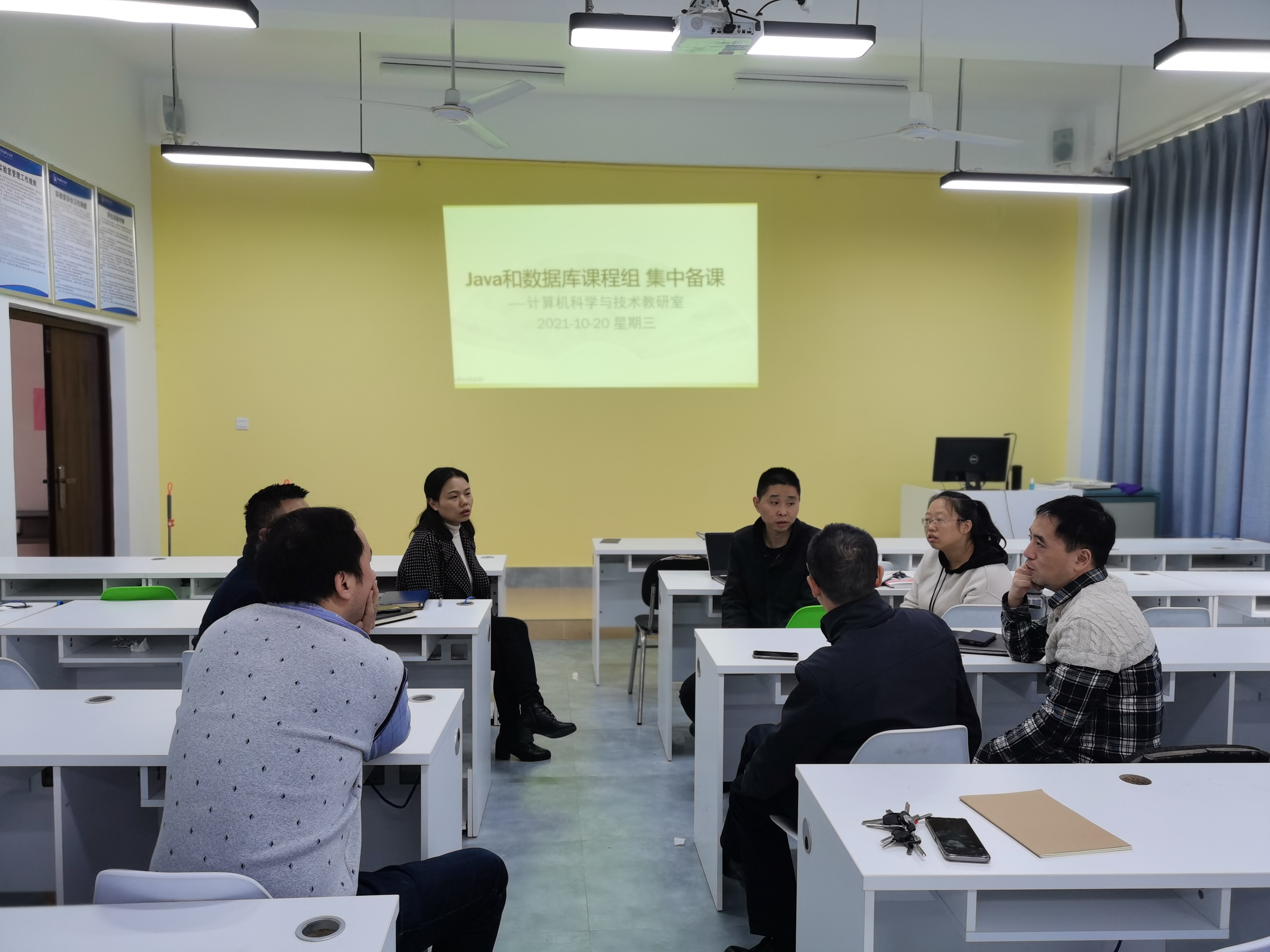 【本网讯】2021年10月20日下午,计算机科学与技术专业教研室按课程组开展了集中备课活动,程序设计基础与计算思维导论课程组在实验楼B107开展,Java和数据库课程组在实验楼B108开展,各课程组全体老师参加了此次活动。