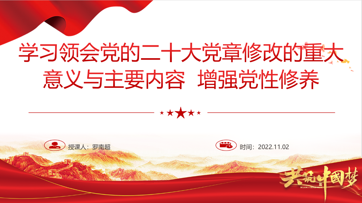 接着罗南超围绕党的二十大党章修改的重要意义、主要内容以及增强党性修养三个方面进行深入讲解。罗南超讲到党的二十大党章修改的重要意义是坚持和发展习近平新时代中国特色社会主义思想的必要要求、是全面建设中国特色社会主义现代化国家的必然要求、是坚持党的全面领导,全面从严治党,加强党的建设的必然要求。把关于全面从严治党的一系列行之有效的新内容写入党章,有利于深化坚持党的全面领导,深入推进全面从严治党,加强党的建设。