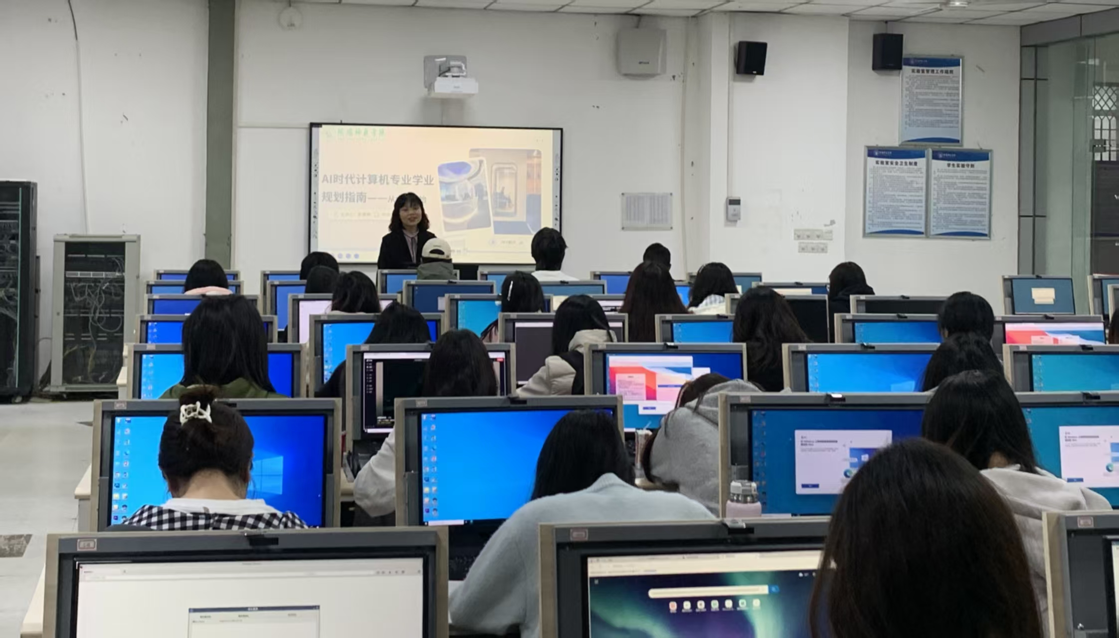 【本网讯】2025年10月15日中午13:00,计算机科学与技术学院在学院公共机房3,为2025级计算机科学与技术专业及软件工程专业的新同学们带来了一场题为“AI时代下的计算机专业学业规划”的专题讲座。讲座由罗南超计算机基础名师工作室成员李唐辉副教授主讲,现场座无虚席,气氛热烈,为初入大学校园的学子们指明了在人工智能浪潮下的学习方向与发展路径。